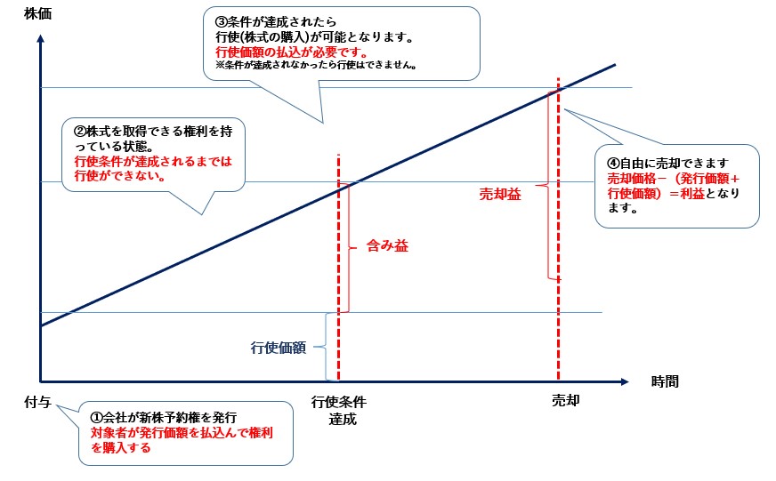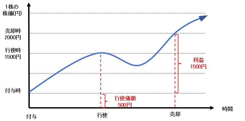 権利行使価額と売却時の株価との差をキャピタルゲインとして報酬を得る仕組みです。